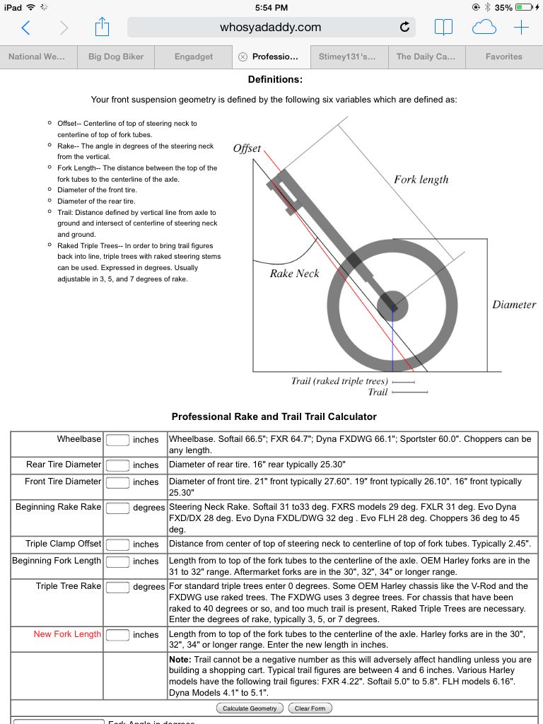 Do not rely on measures for exact accuracy. The rake and trail calculator will calculate mechanical and normal trail based on values for rake, offset and front tire radius. In bikes constructed without an offset, the trail and the rake vary proportionally. Understanding a motorcycle's rake and trail. Homemade anti use this calculator to see what the chassis, rake, forks and triple clamps have to do with your magical trail figure. Chopper motorcycle rake and trail calculator. While relatively simple on the surface, motorcycle trail and rake play important roles in how your motorcycle performs, balances, and responds. Total offset (triple clamp + axle offset). Firms like these can supply you with complete motorcycles or frames that have specialized triple clamps and front ends. Motorcyclists tend to speak of trail in relation to rake angle. Professional rake and trail trail calculator. Bicycle trail is the most important part of a bicycle's geometry for determining how the bicycle please note in the chart below that reducing fork rake increases trail. Trail is the horizontal distance between your bike's steering axis and the center of the front tire's contact patch.